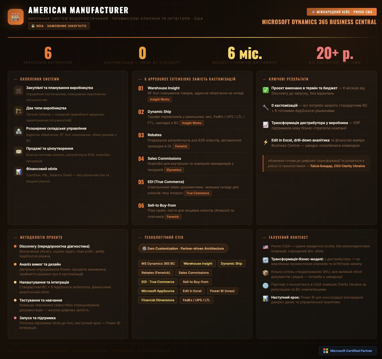 Цей проєкт цікавий тим, що замовник обрав таку схему реалізації: для реалізації власних вимог обмежився тільки використанням стандартної функціональності Business Central, не замовив жодної кастомізації, а для забезпечення специфіки певних процесів сміливо використав кілька партнерських додатків з Microsoft AppSource, створених в середовищі Business Central.