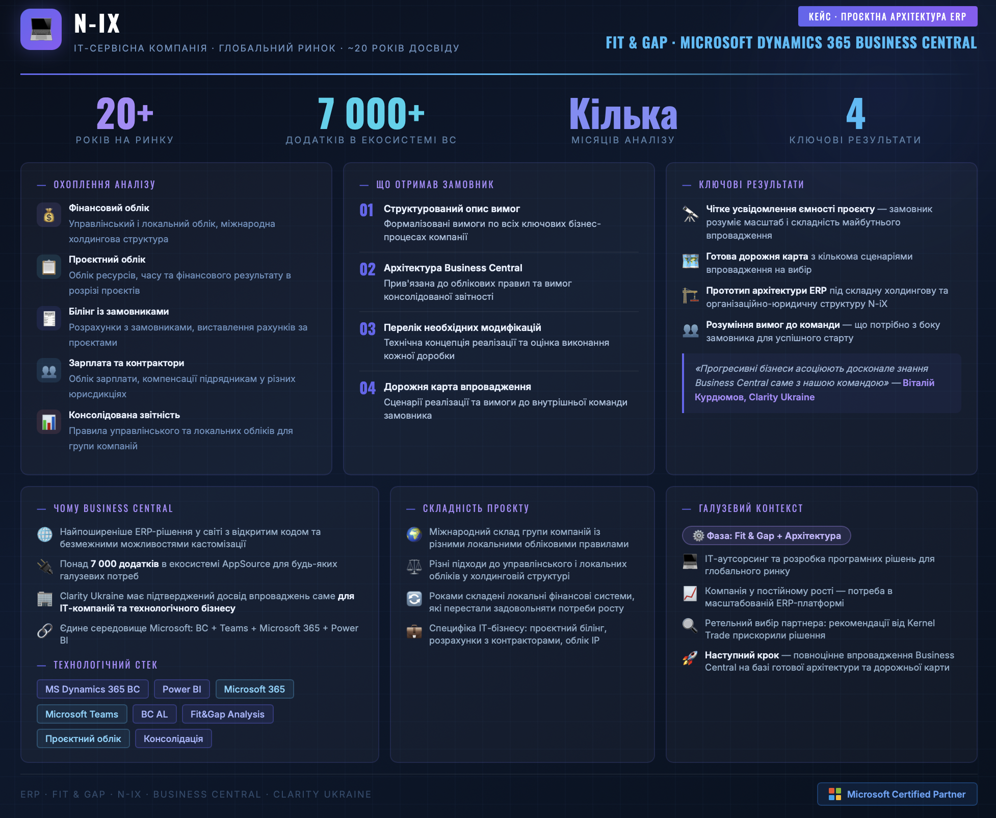 Аналіз процесів компанії у фінансовому обліку, проєктному обліку, розрахунків з замовниками (біллінгу), обліку зарплати та компенсацій контакторам з урахуванням складної організаційно-юридичної структури стали основною складовою роботи на даному проєкті. Велику частину часу було приділено підбору і опрацюванню архітектури майбутньої ERP, беручи до уваги різні підходи до правил управлінського і локальних обліків, побудови консолідованої фінансової звітності тощо. Задача непроста, але зі сторони Clarity Ukraine були залучені найдосвідченіші фахівці, які мають багаторічний досвід впровадження Business Central, в тому числі досвід реалізації різноманітних вимог у холдингових структурах та в ІТ-індустрії.
